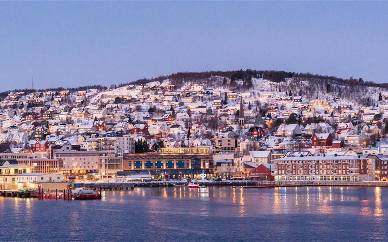 visite guidée à pied de la ville, située à 69 degrés nord soit à 320 km au-dessus du cercle polaire arctique. Malgré sa situation extrême, vous serez surpris de voir que Tromsø abrite des hôtels aux normes internationales, des cafés animés, des restaurants de fruits de mer réputés, une vie culturelle riche, une vie nocturne très développée, ainsi que des musées et galeries d'art. Promenez-vous dans la vieille ville partiellement piétonne qui a conservé ses anciennes maisons de bois aux couleurs harmonieuses. Vous y découvrirez également la plus grande cathédrale en bois de Norvège (extérieur).