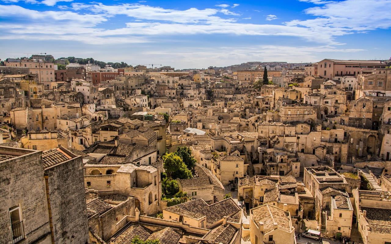 Matera, dans la région de la Basilicata où l'on se rend surtout pour admirer les « Sassi », maisons des quartiers troglodytiques formées par des bâtiments blancs, superposés de telle manière que les toits servent de rues. Ces maisons-grottes inhospitalières, sans eau courante ni électricité, étaient habitées par des familles entières jusqu'aux années 1950 quand, honteux, le gouvernement décide de les évacuer. Quarante ans plus tard, grâce à une poignée d'habitants, la ville va renaître de ses cendres. Matera a été classée au patrimoine mondial de l'UNESCO en 1993.