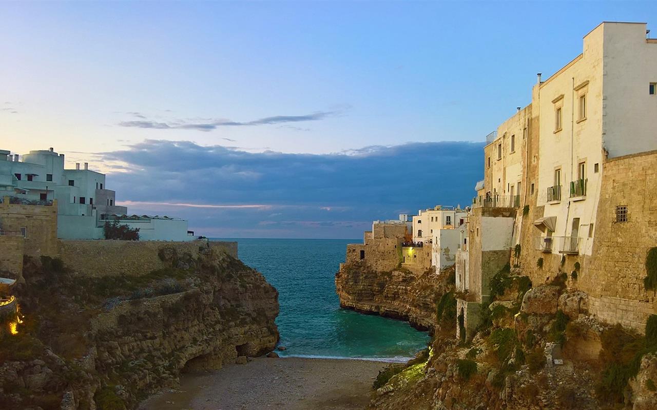 une promenade en bord de mer par le centre de Polignano à Mare, ville bâtie sur les falaises avec sa belle petite plage de Lama Monachile.