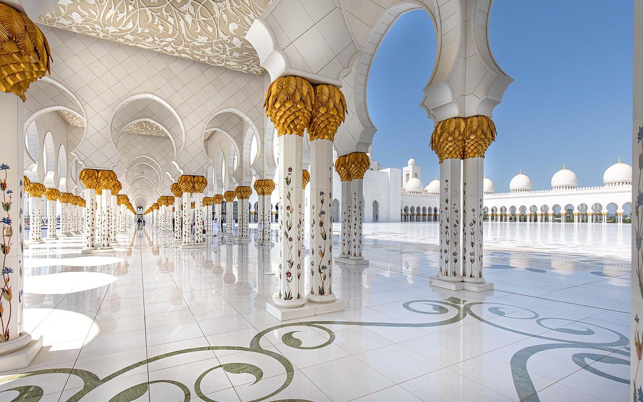 mosquée Sheikh Zayed, monument imposant avec ses 82 dômes, ses plus de 1000 colonnes, ses lustres dorés de 24 carats et le plus grand tapis noué à la main du monde. C'est l'une des plus grandes mosquées des Emirats Arabes Unis.