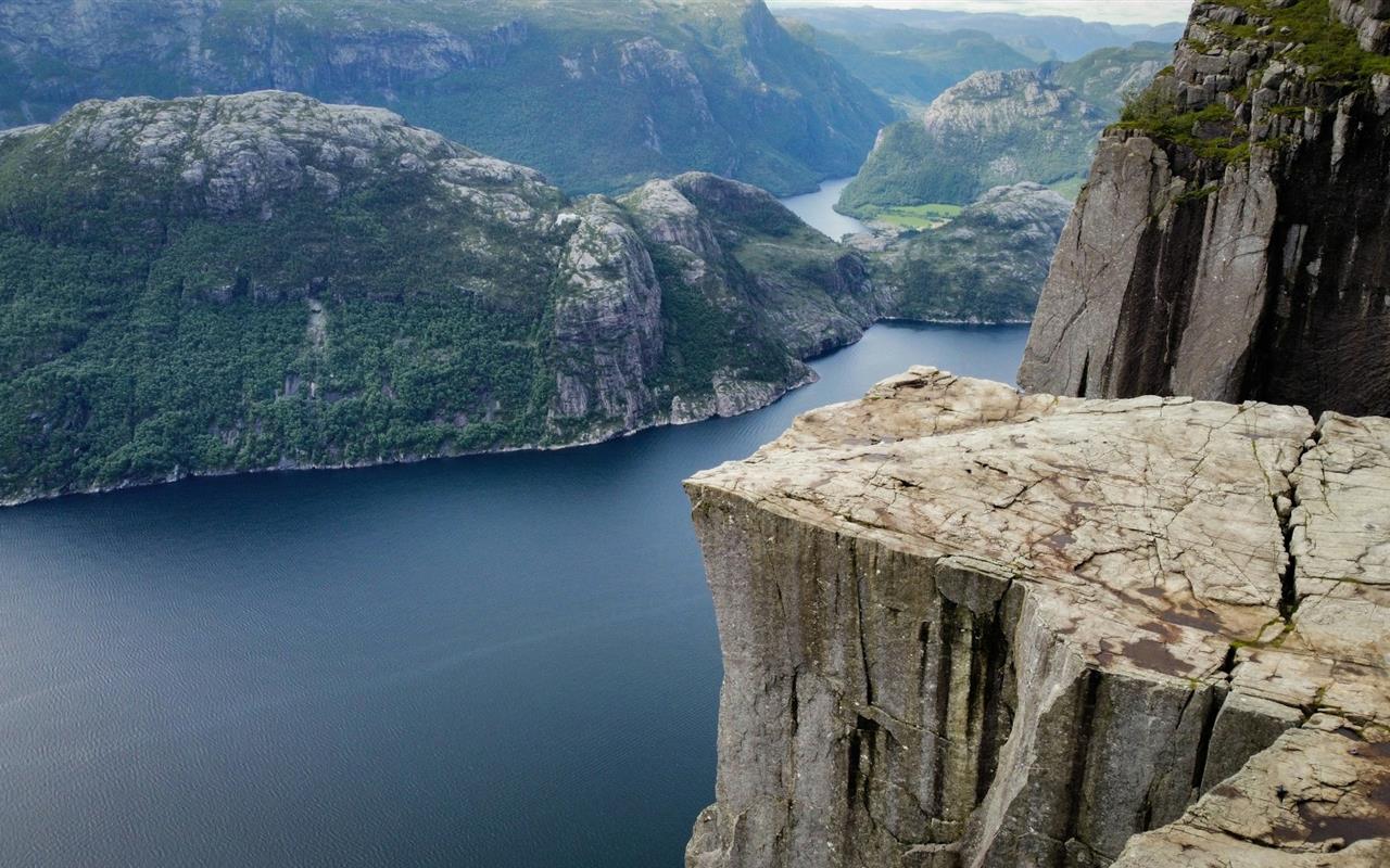 célèbre Preikestolen, immense promontoire rocheux dominant le fjord à plus de 600 mètres de hauteur. Une expérience saisissante au plus près d'une nature brute et préservée.