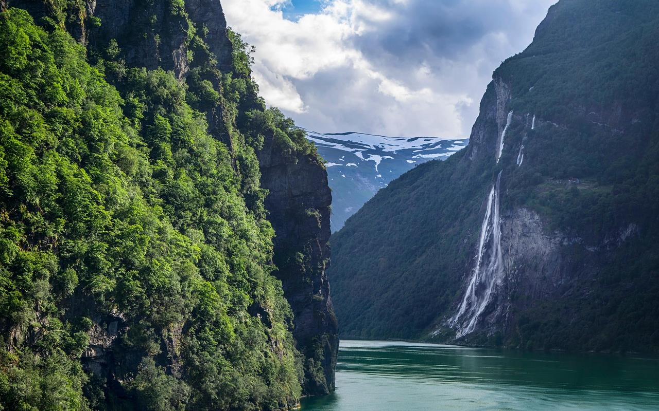 croisière d'une heure sur le majestueux Geirangerfjord, classé au patrimoine mondial de l'UNESCO. L'un des fjords les plus étroits et spectaculaires du pays, encadré de falaises vertigineuses d'où se jettent des cascades célèbres telles que le « Voile de la Mariée » ou les « Sept Soeurs ».