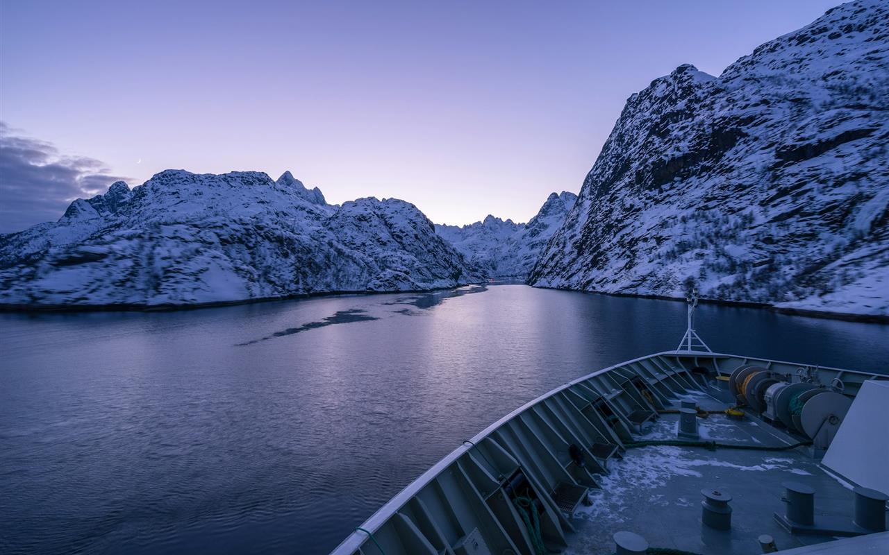 Vous naviguez ensuite dans l'obscurité du Vestfjord pour y observer des aurores boréales (si le temps le permet). Une navigation lente et silencieuse le long du « mur des Lofoten » aux sommets escarpés en direction de Svolvær rendra ce moment inoubliable.
