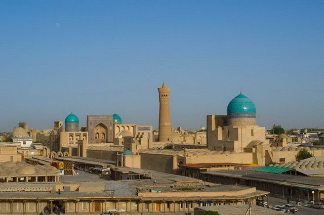 Découverte de celle qui fut lieu de prière et d’étude et qui connut son apogée au 10e s. : la citadelle de l’Ark, résidence fortifiée des khans de Boukhara (sauf mercredi), la mosquée Bolo Khauz et son bassin, le mausolée Samanide, l’ensemble Poï-Kalian protégé par l’UNESCO et son minaret, le joli complexe de Laby Khauz (16e - 17e s.) et son bassin entouré de médersas, les coupoles marchandes et la mosquée Maghok I Atttari. En fin de journée, spectacle de musique dans une ancienne médersa. (P.déj+Déj)
